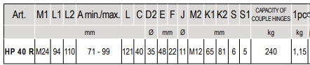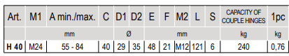 Únosnost: u všech tří variant této řady (H 40, HN 40 i HP 40 R) je únosnost 240 kg na jeden pár pantů. Komponenty jsou galvanicky zinkovány pro ochranu proti korozi.